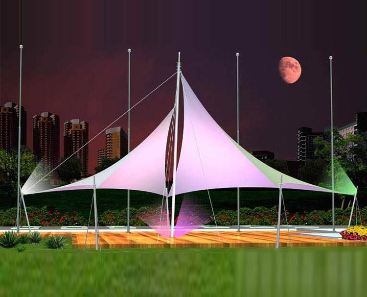 由于膜材料本身應(yīng)有的顯色性,在夜間彩燈的映射下能形成絢麗繽紛的景觀,不僅為人們提供遮陽避雨的空間。同時,更由于這種生動活潑的造型能給人們帶來時尚、輕松的休閑感受,所以廣受歡迎。